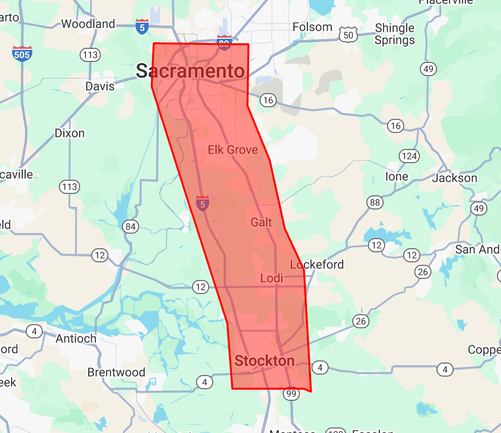 We currently serve a large portion of Sacramento County and San Joaquin County. Don’t see your city in the list down below? We’re constantly expanding. Give us a call to see if we can come out to your area!